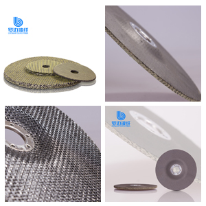 “羅邊玻璃纖維增強砂輪網(wǎng)片 是采用玻璃纖維增強網(wǎng)布涂以酚醛、環(huán)氧改性樹脂,經(jīng)烘培后沖切而成,裁切采用外徑、內(nèi)孔一次沖切成形工藝。因此,網(wǎng)片具有尺寸公差小,同心度好,周邊光潔等優(yōu)點。該產(chǎn)品主要為不織布復合網(wǎng)片、黒紙復合網(wǎng)片和純網(wǎng)片,具有極好的耐熱性、高速切割性能及高結(jié)構(gòu)強度。“